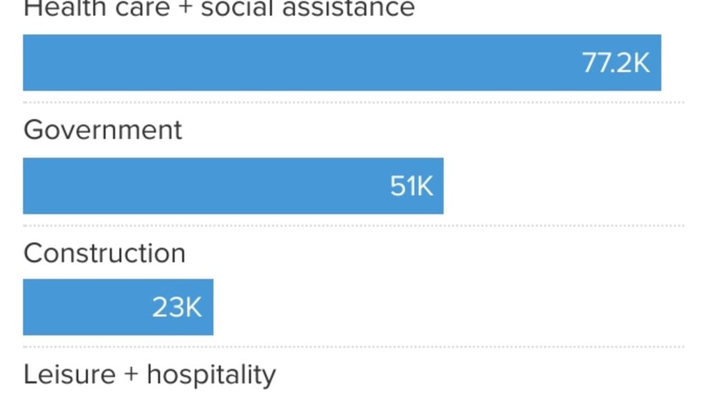 Other areas showed meager job growth and saw employment shrink. Mining and logging, utilities and retail trade combined to add just 2,500 jobs. Information shed 9,000 jobs, while transportation and warehousing lost more than 12,000 jobs.
